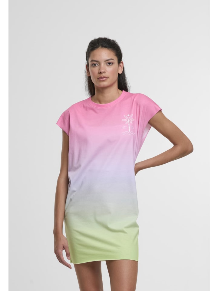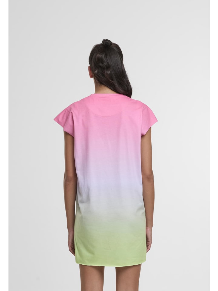 Это повседневное платье свободного кроя, легкое, похожее на трикотаж, с мягким градиентным рисунком, идеально подходит в качестве простого повседневного слоя. Круглый вырез горловины создает чистый, непринужденный вид, а обрезанные рукава создают плавную линию плеч и обеспечивают свободу движений. Прямой крой выше колена создает свободный силуэт, который идеально подходит как для городских прогулок, так и для похода на пляж. Гладкая поверхность и легкость в уходе за смесовой тканью позволяют легко носить и комбинировать платье, не жертвуя комфортом.