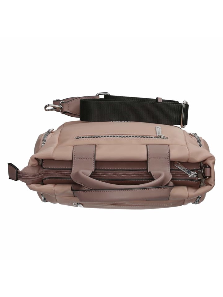 Эта женская сумка Kaerlek из нейлона розового (лилового) цвета сочетает в себе современную элегантность и практичность. Фирменный лейбл спереди и блестящие серебристые акценты придают ей стильный вид. Две прочные ручки и дополнительный съемный плечевой ремень (примерно 130 см) обеспечивают гибкие возможности переноски. Усиленное дно обеспечивает устойчивость, а два боковых внешних кармана на молнии, передний и задний, предлагают дополнительное место для хранения мелких предметов. Основное отделение на молнии оснащено двумя накладными карманами и одним карманом на молнии для аккуратного хранения личных вещей. Размеры сумки составляют примерно 21 x 24 x 13 см (В x Ш x Г), что делает ее идеальным выбором для повседневного использования и гармонично дополнит любой образ.