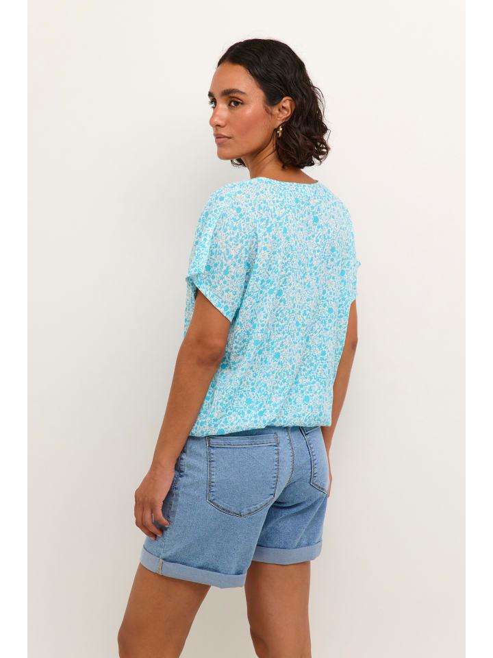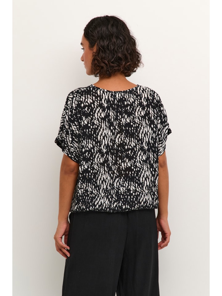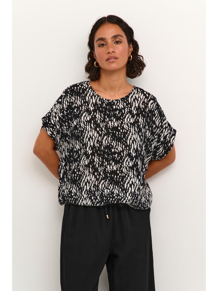 Эта блузка с принтом зебра имеет свободный крой, круглый вырез и короткие рукава. Воздушная и слегка прозрачная, она создает стильный и непринужденный образ.