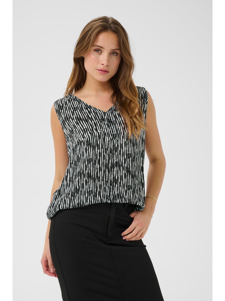 Безрукавка с геометрическим узором по всей поверхности и едва заметным V-образным вырезом. Прямой крой, струящаяся фактура поверхности.