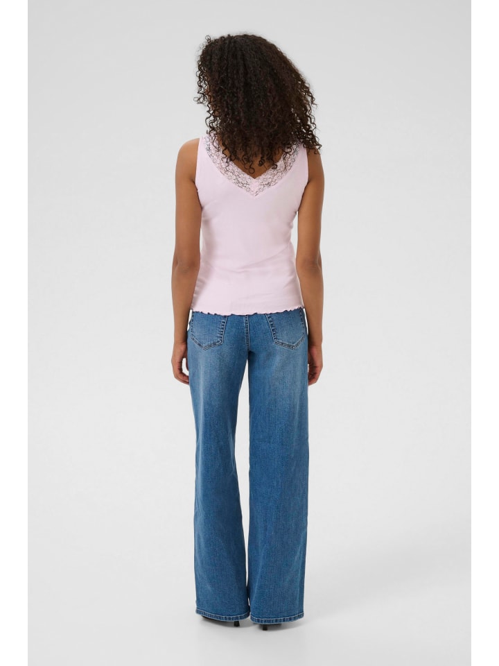 Женский топ без рукавов с V-образным вырезом, нежной кружевной отделкой и ребристым кроем. Облегающий крой обеспечивает удобную посадку и универсальность.