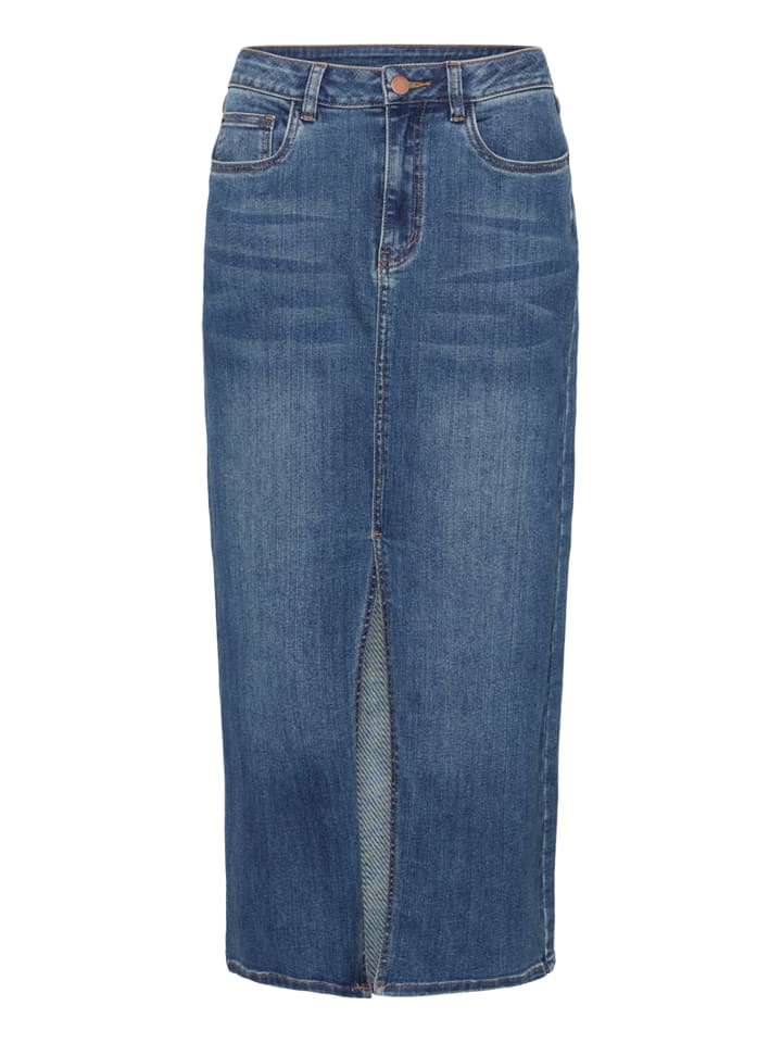 Джинсовая юбка миди прямого силуэта, классического пятикарманного кроя с разрезом спереди. Шлевки для ремня и застежка на пуговицу и молнию добавляют стильный вид.