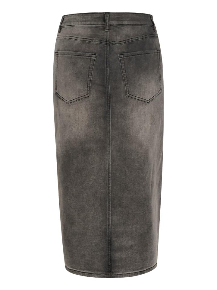 Джинсовая юбка миди прямого силуэта, классического пятикарманного кроя с разрезом спереди. Шлевки для ремня и застежка на пуговицу и молнию добавляют стильный вид.