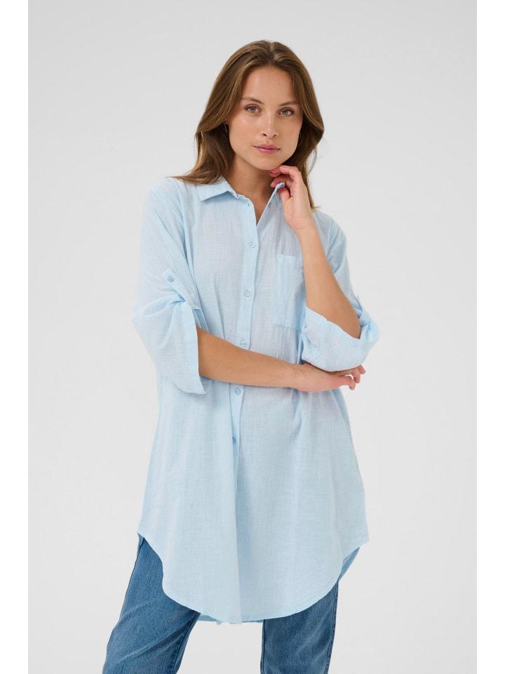 Длинная рубашка-туника прямого покроя, с застежкой на пуговицы по всей длине, классическим воротником, нагрудным карманом и закатанными рукавами. Тонкая структура.