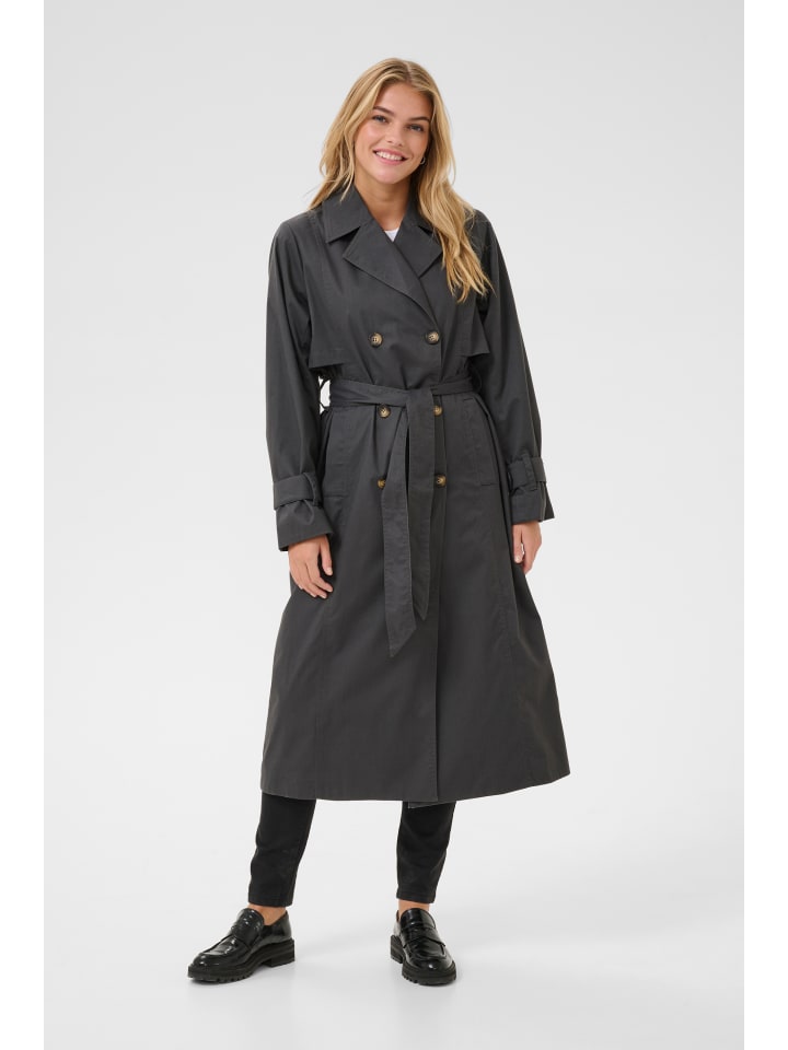 Длинный двубортный тренчкот с застежкой на пуговицы, прямым кроем и воротником с отворотами. Завязывающийся пояс, манжеты на пуговицы и боковые карманы.