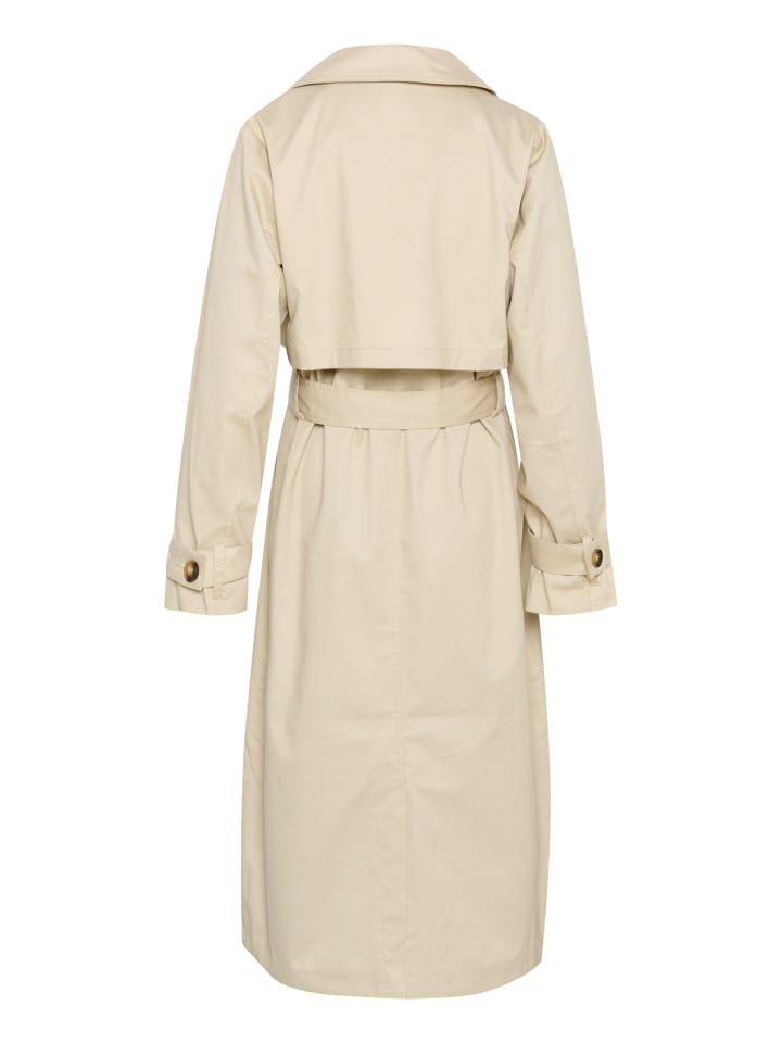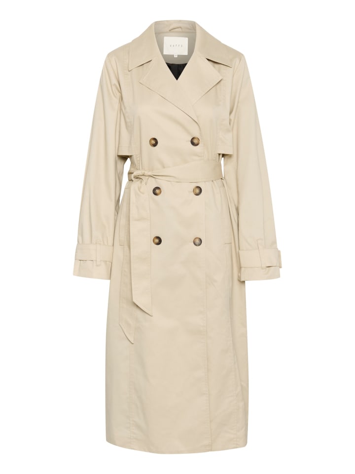 Длинный двубортный тренчкот с застежкой на пуговицы, прямым кроем и воротником с отворотами. Завязывающийся пояс, манжеты на пуговицы и боковые карманы.