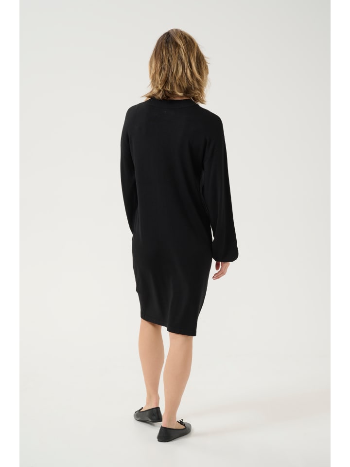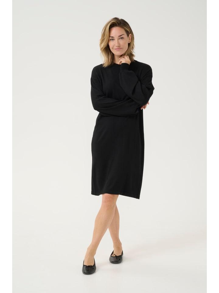 Черное платье прямого кроя, классический круглый вырез горловины, длинные рукава с манжетами и гладкая, мягкая отделка до колена.