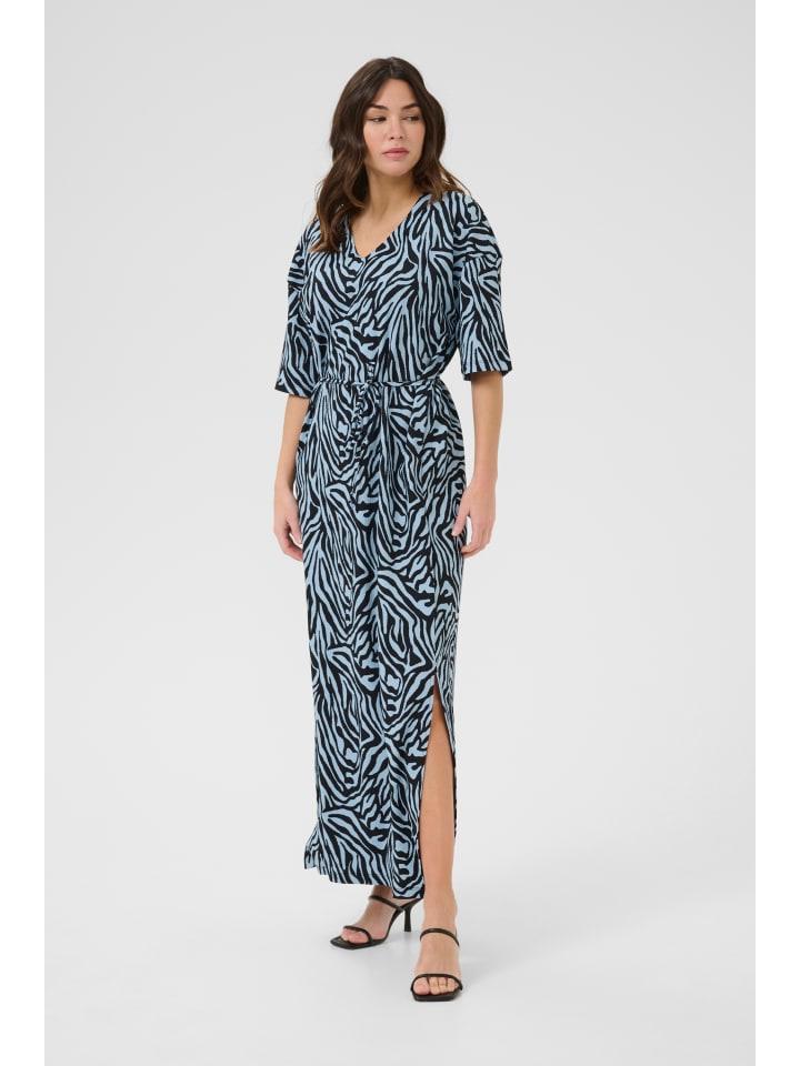 Платье макси прямого кроя с V-образным вырезом, широкими рукавами и поясом. Разрез сбоку обеспечивает дополнительную свободу движений.