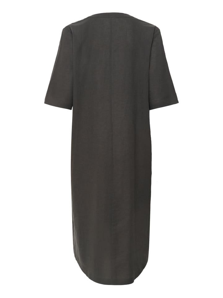 Платье миди свободного кроя с мягким силуэтом, V-образным вырезом, рукавами до середины икры, закругленным подолом и боковыми карманами.