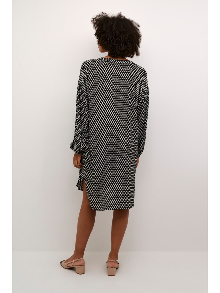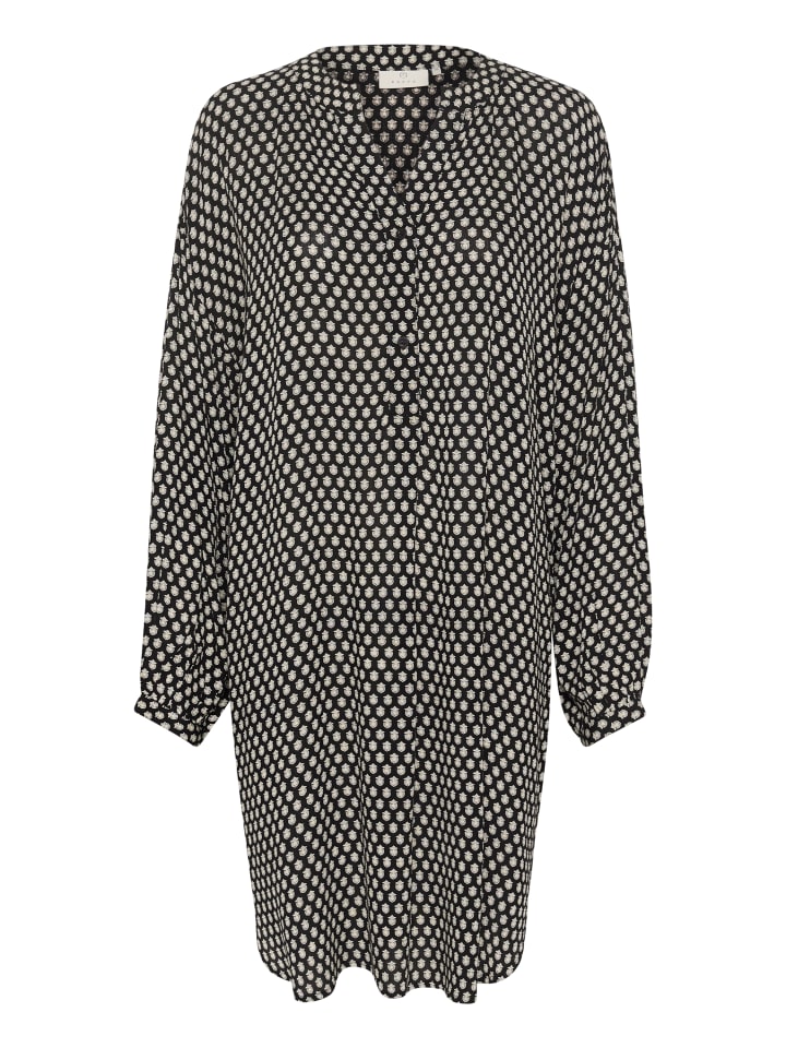 Платье свободного покроя с эффектным бантом, застежкой на пуговицы по всей длине, V-образным вырезом и длинными, слегка присборенными рукавами.