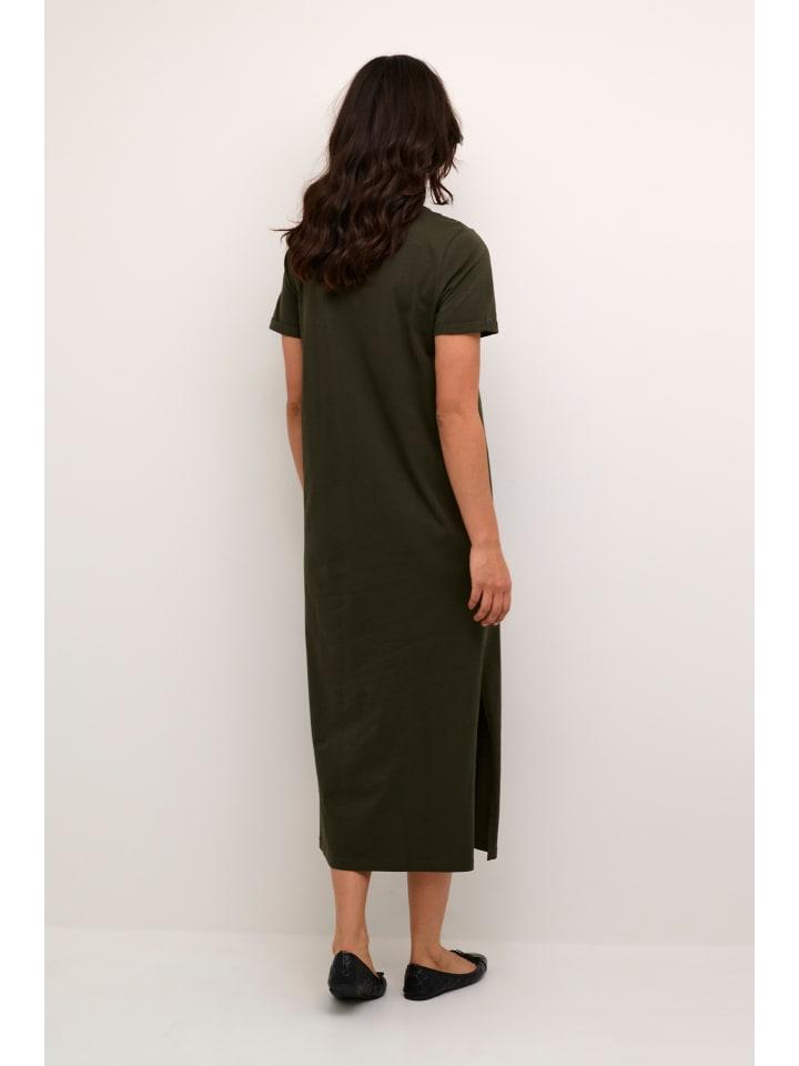 Платье-футболка прямого кроя длиной до щиколотки с классическим круглым вырезом, короткими рукавами, гладкой отделкой и разрезом сбоку.
