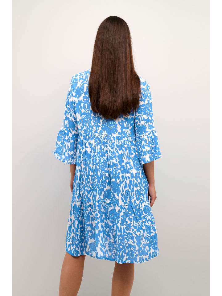 Платье длиной до колена с эффектным узором по всей поверхности, свободным кроем, V-образным вырезом и расклешенными рукавами длиной 3/4. Многоярусная юбка со сборками.