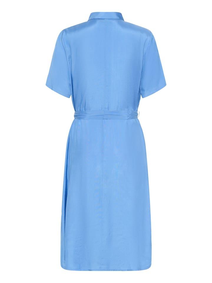 Платье-рубашка прямого силуэта длины миди, застежка на пуговицы спереди, короткие рукава, классический воротник и пояс на талии.