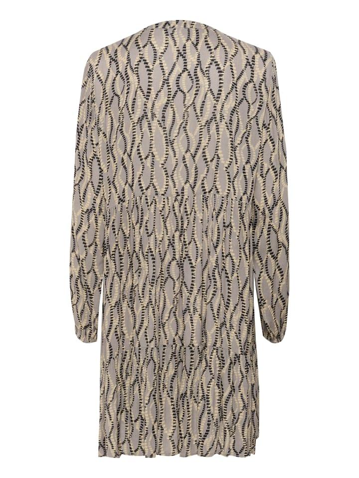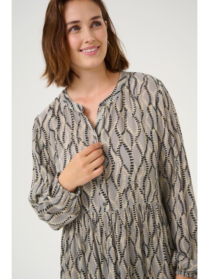 Мини-платье с узором пейсли свободного кроя, длинными рукавами и многоуровневым подолом. Круглый вырез с разрезом и мягкий, струящийся силуэт.