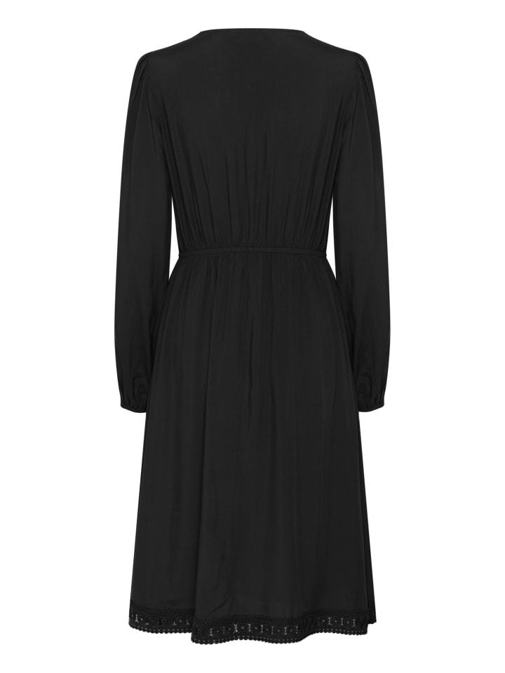Платье миди с V-образным вырезом, декоративной кружевной отделкой по вырезу и подолу, длинными присборенными рукавами и подчеркнутой талией.