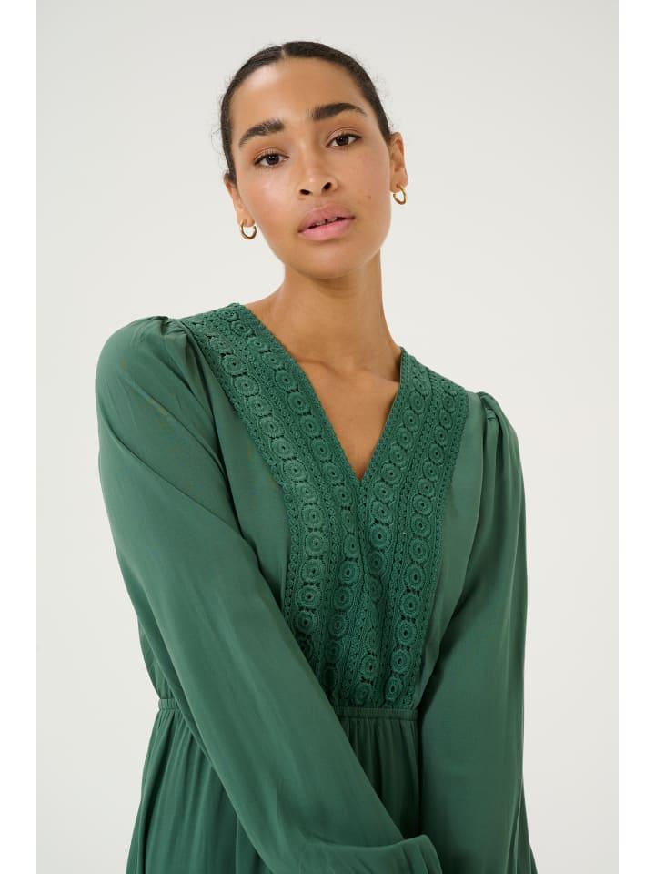 Платье миди с V-образным вырезом, декоративной кружевной отделкой по вырезу и подолу, длинными присборенными рукавами и подчеркнутой талией.