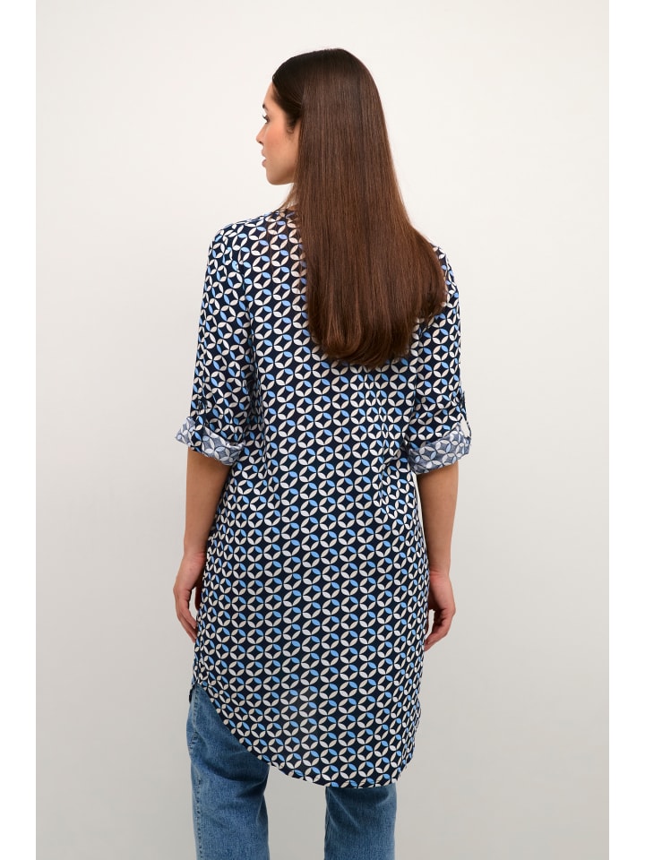 Рубашка-туника в полоску свободного прямого кроя с мягкой текстурированной отделкой. V-образный вырез с вставкой, планка на половинках пуговиц и закатанные рукава длиной 3/4.