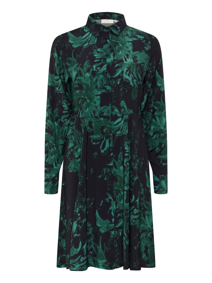 Платье-рубашка с абстрактным рисунком, застежкой на пуговицы по всей длине и классическим воротником. Длинные рукава, облегающий верх и широкая юбка.