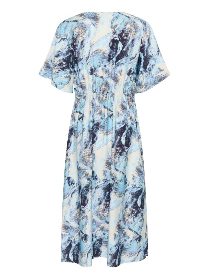 Платье миди струящегося силуэта с V-образным вырезом, эффектным сгибом спереди и короткими широкими рукавами. Дополнено абстрактным рисунком.