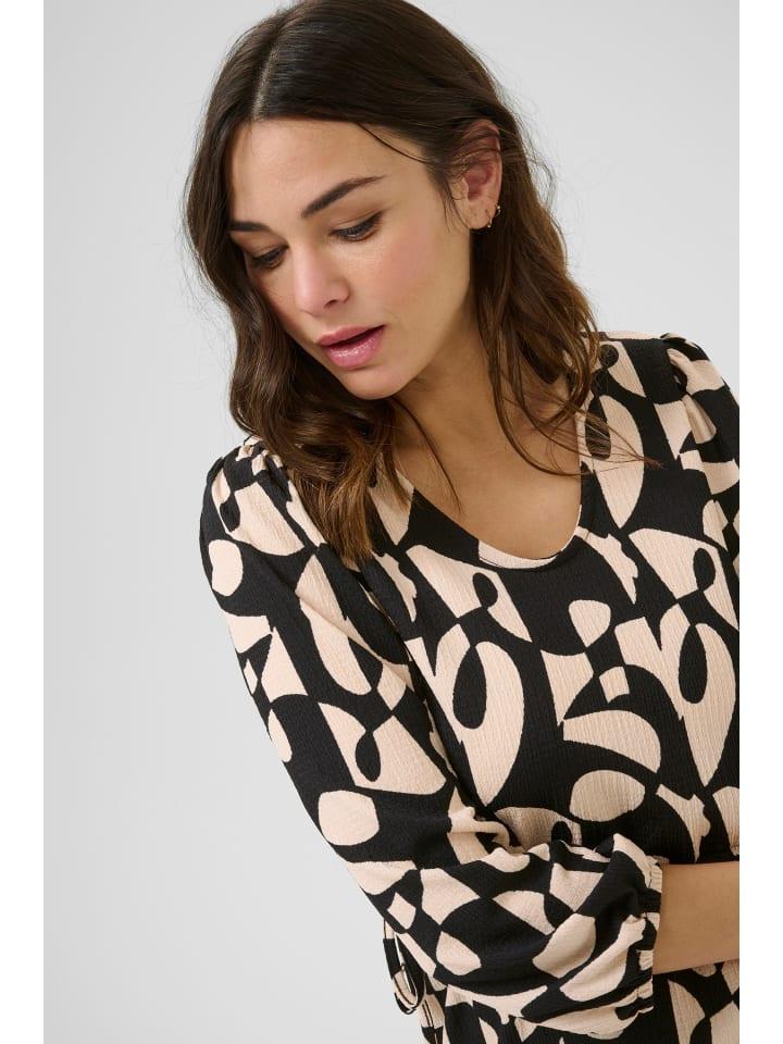 Современное платье миди прямого кроя с V-образным вырезом, объемными рукавами 3/4 и эластичной талией. Струящийся, структурированный силуэт.