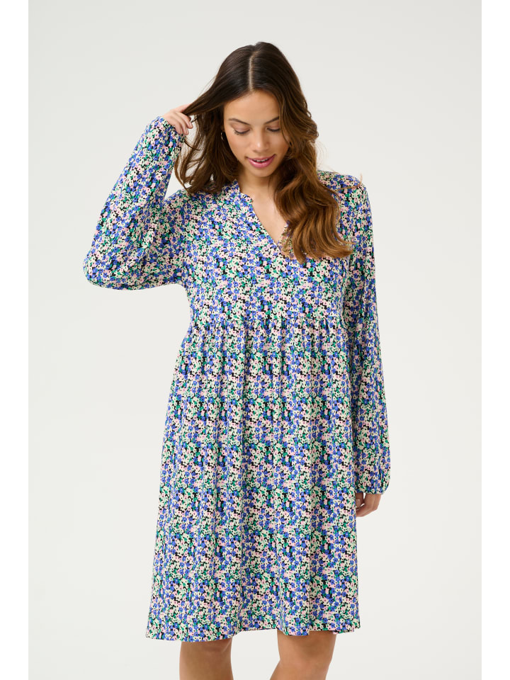 Классное платье с цветочным принтом, свободного А-силуэта, V-образным вырезом и длинными рукавами. Свободное, воздушное, с струящимся силуэтом.