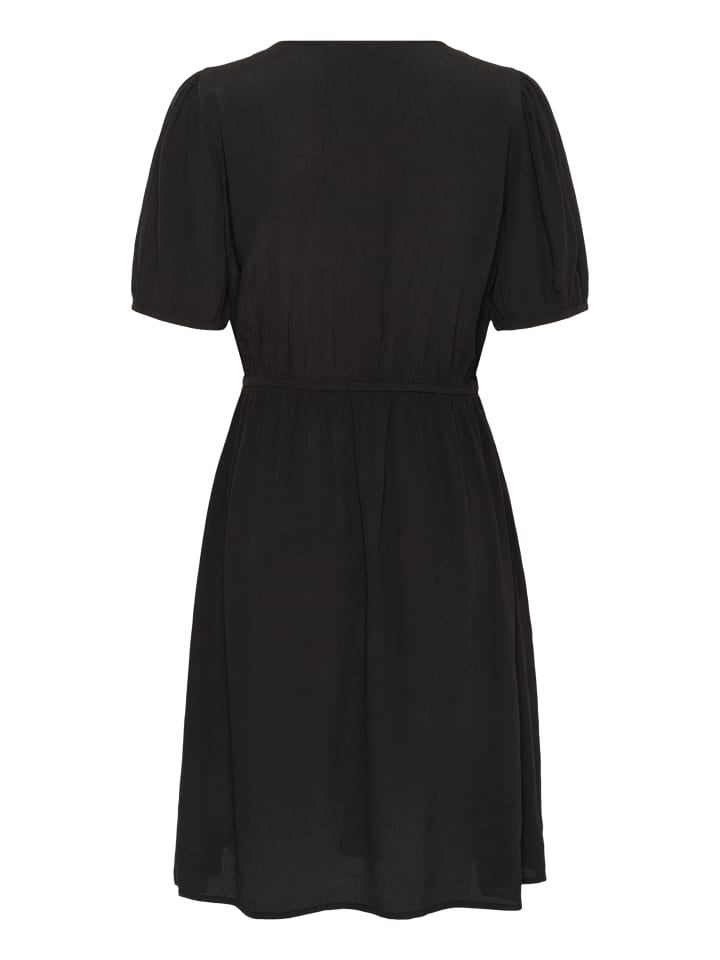 Короткое платье с V-образным вырезом, планкой на пуговицах и легким силуэтом. Короткие рукава с буфами, пояс и прямой подол до колена.