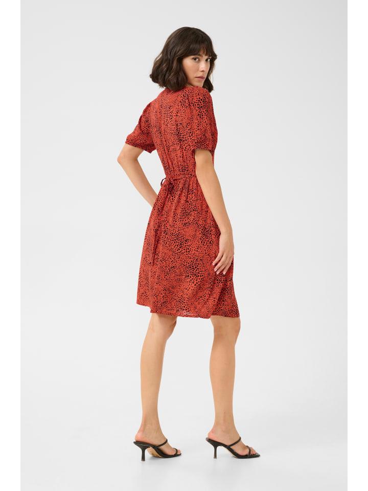 Короткое платье с V-образным вырезом, планкой на пуговицах и легким силуэтом. Короткие рукава с буфами, пояс и прямой подол до колена.