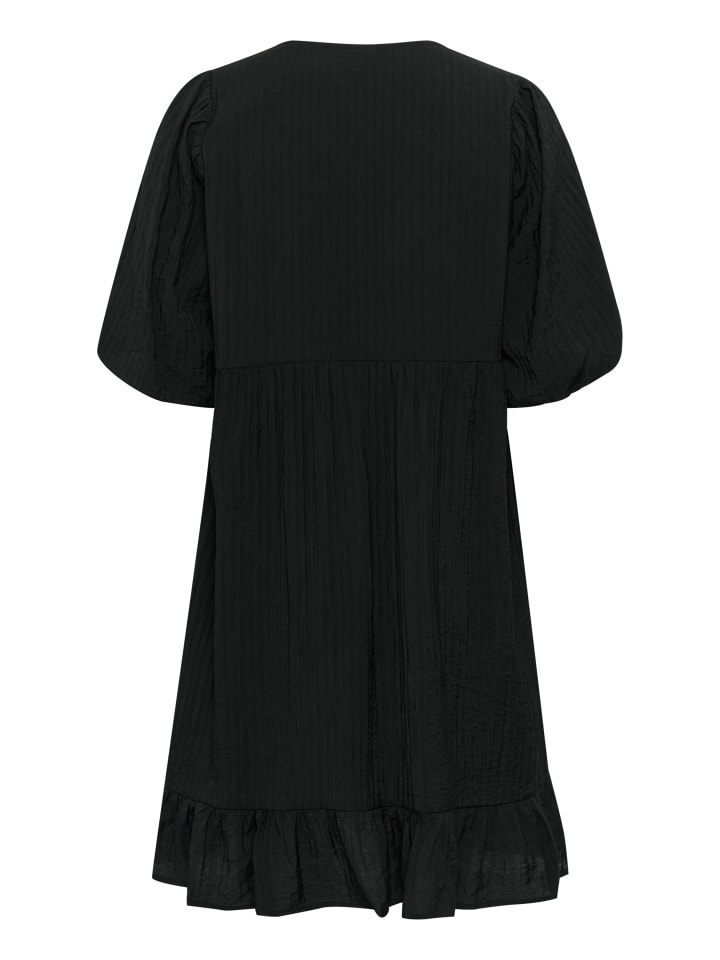 Черное короткое платье с V-образным вырезом, воздушными рукавами-буфами, изящной вертикальной структурой, планкой на пуговицах спереди и игривым оборкой по низу.