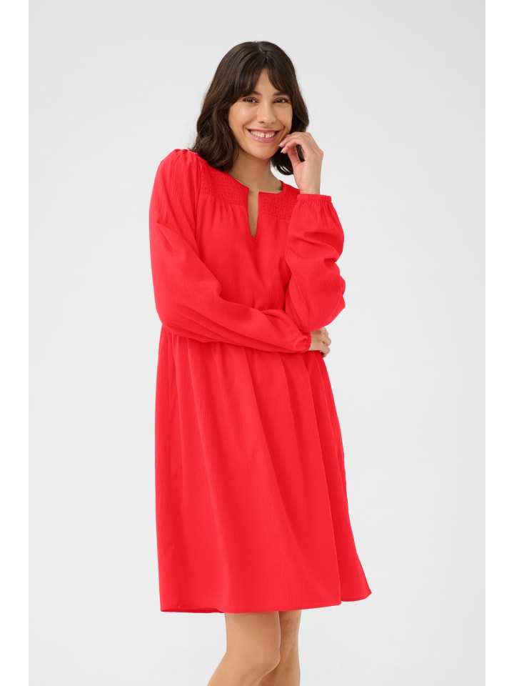 Современное синее платье прямого кроя, с присборенной юбкой, длинными рукавами, разрезом на горловине и структурированным лифом.