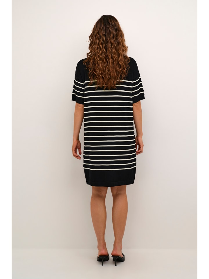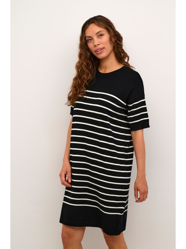 Современное полосатое платье прямого силуэта с ребристым круглым вырезом и короткими рукавами. Горизонтальные полосы создают классический образ.