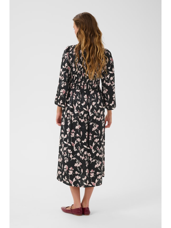 Платье миди с цветочным принтом по всей поверхности, присборенным верхом, длинными рукавами и струящейся широкой юбкой. V-образный вырез для современного образа.