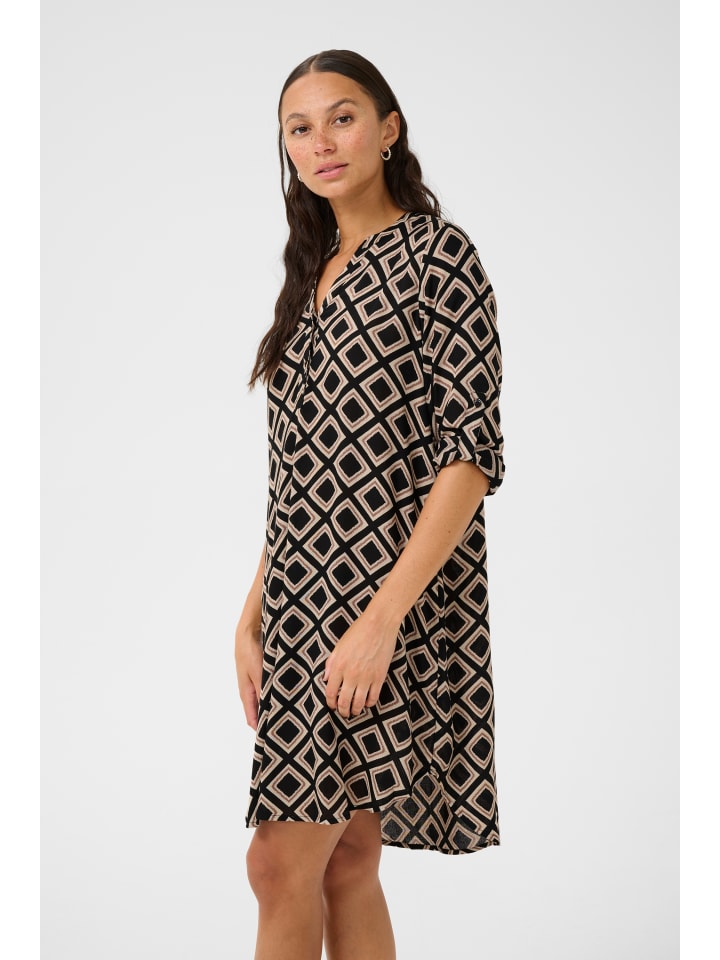 Платье-рубашка с геометрическим узором по всей поверхности, свободный крой, V-образный вырез, короткая планка на пуговицах и длинные закатанные рукава.