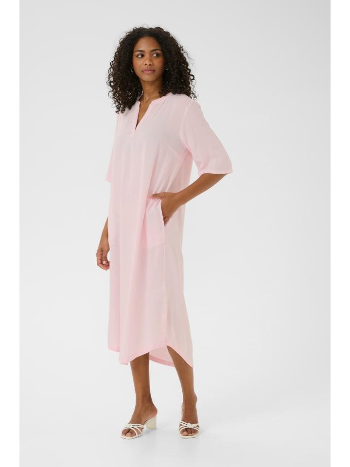 Это свободное макси-платье обеспечивает комфортную посадку благодаря V-образному вырезу с тонким воротником и рукавам до середины голени. Прямой силуэт универсален и идеально подходит для повседневной носки.