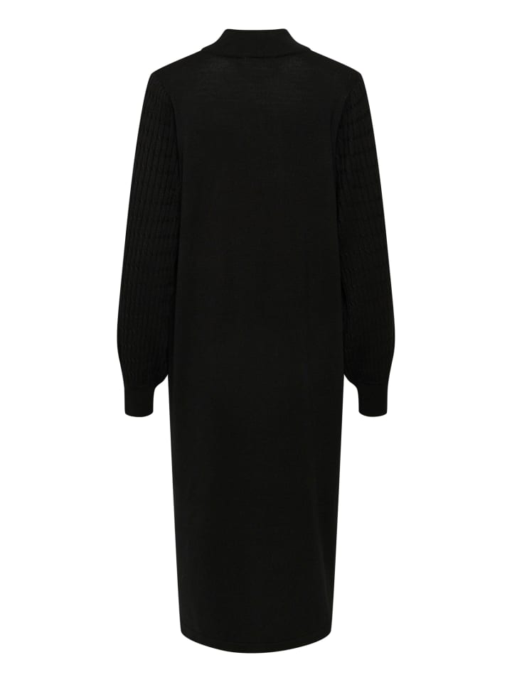 Это платье миди прямого кроя, с объемными длинными рукавами и воротником-стойкой. Гладкая отделка на торсе, рукава с резинкой.