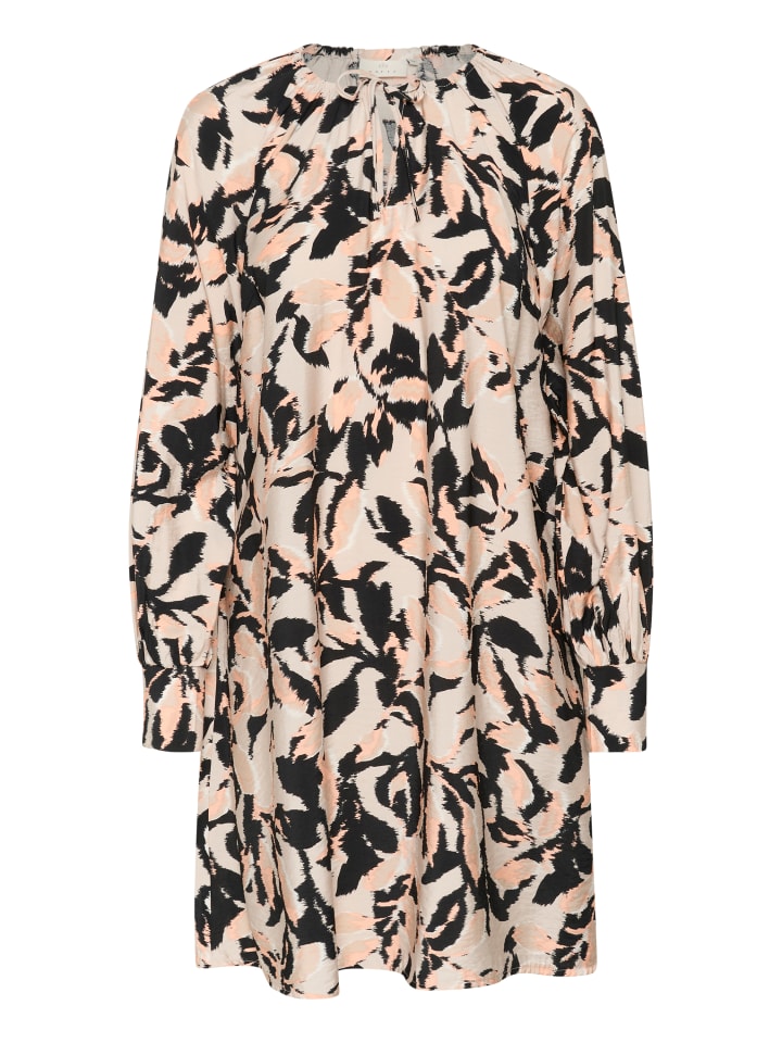 Воздушное мини-платье свободного А-силуэта, с присборенным круглым вырезом на завязке и длинными объемными рукавами с манжетами.