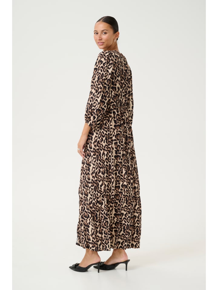 Платье макси с леопардовым принтом прямого свободного кроя. Круглый вырез горловины, завязка, рукава 3/4 и боковые карманы.