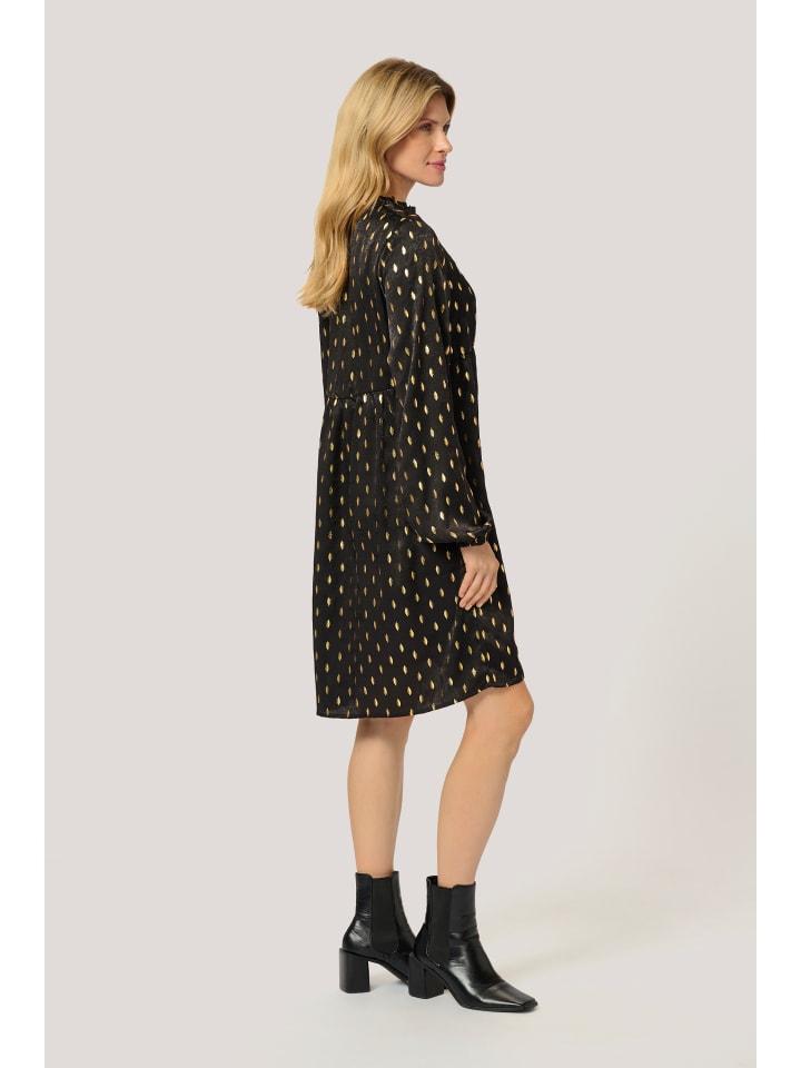 Это мини-платье впечатляет свободным кроем, приталенным фасоном, длинными объемными рукавами, декоративным разрезом на воротнике и равномерным рисунком в виде металлизированных листьев.