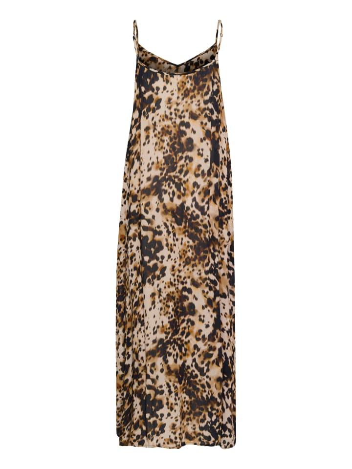 Платье-комбинация с анималистичным принтом, свободного прямого кроя, с регулируемыми тонкими бретельками. Изящный V-образный вырез, длина до щиколотки.