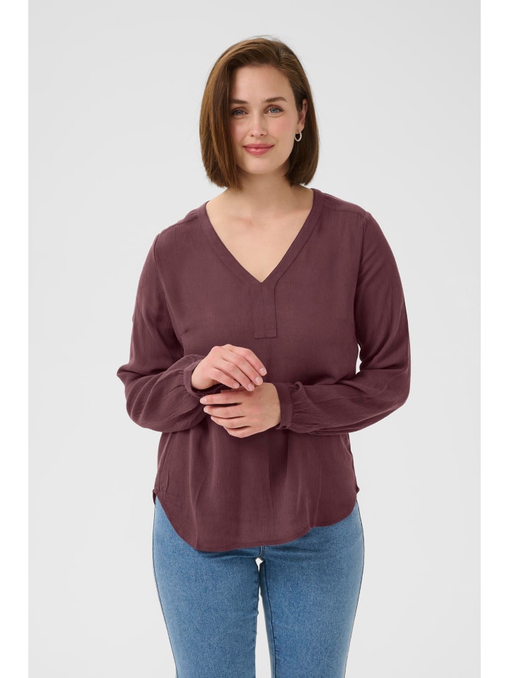 Женская блузка удобного кроя с длинными рукавами, приятная на ощупь. V-образный вырез и слегка закругленный подол обеспечивают разнообразные возможности для создания стильных образов.