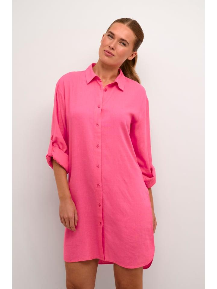 Платье-рубашка прямого кроя с классическим воротником и длинными рукавами с манжетами на пуговицах. Застежка по всей длине, свободный силуэт.