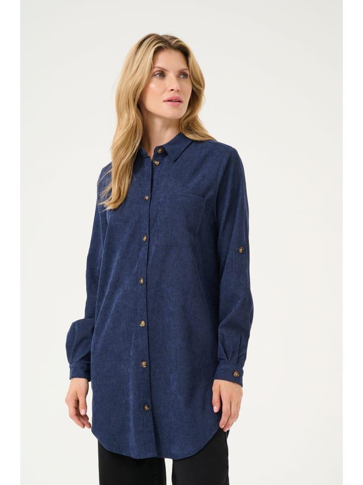 Платье-рубашка прямого кроя с застежкой на пуговицы по всей длине, классическим воротником, нагрудным карманом, длинными отворотами рукавов и мягкой отделкой.