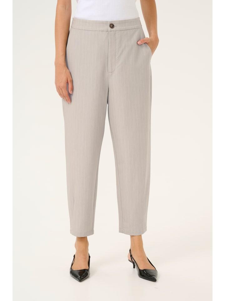 Свободные брюки прямого кроя, с тонким вертикальным кроем и застежкой на пуговицы. Боковые карманы и длина до щиколотки.