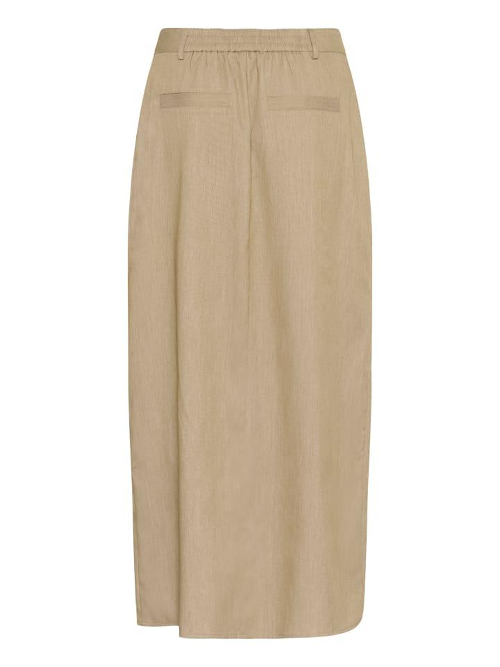 Длинная юбка прямого кроя с мягкой матовой отделкой, приталенный пояс со шлевками для ремня и разрез спереди для большей свободы движений. Застежка на пуговицу и молнию завершает образ.