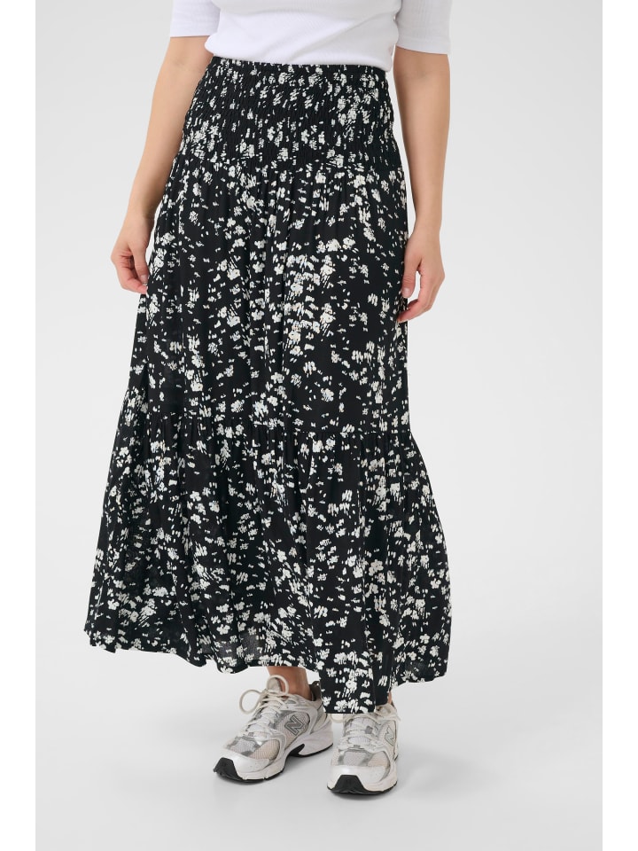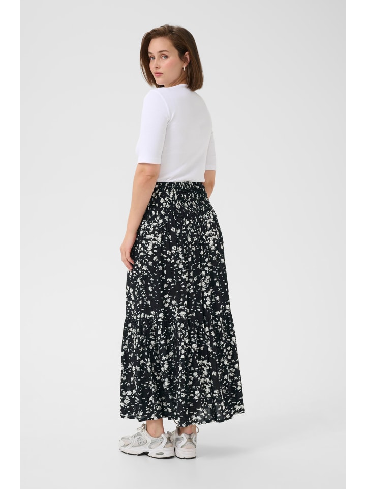 Юбка макси с абстрактным принтом по всей поверхности, широким присборенным поясом и мягким, струящимся многоуровневым силуэтом. Сборки создают современный образ.