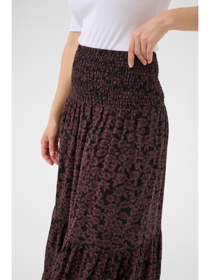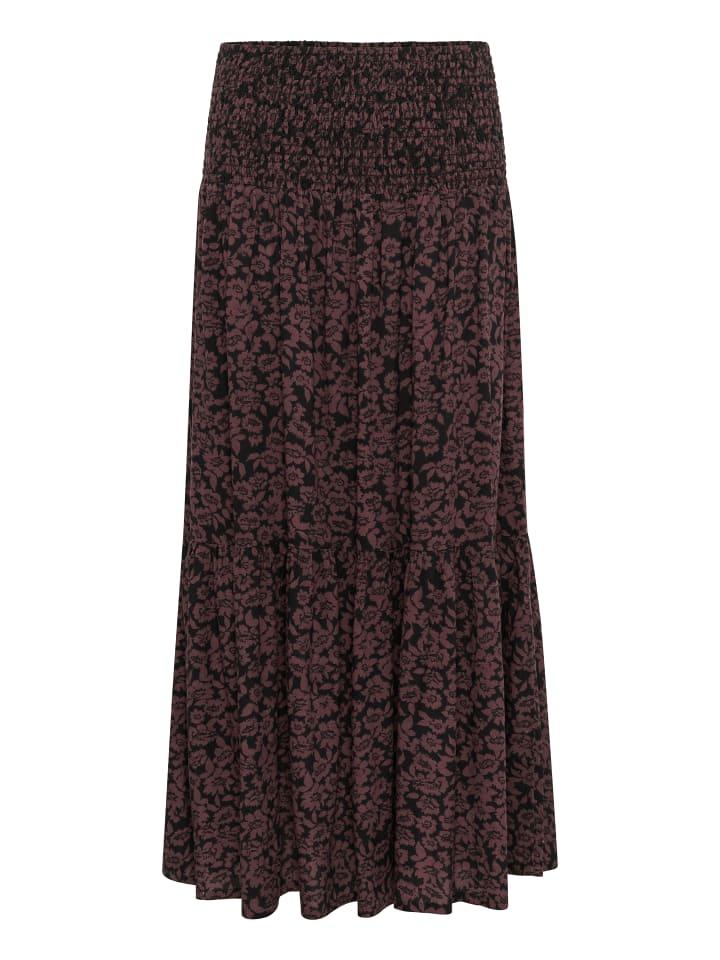 Юбка макси с абстрактным принтом по всей поверхности, широким присборенным поясом и мягким, струящимся многоуровневым силуэтом. Сборки создают современный образ.