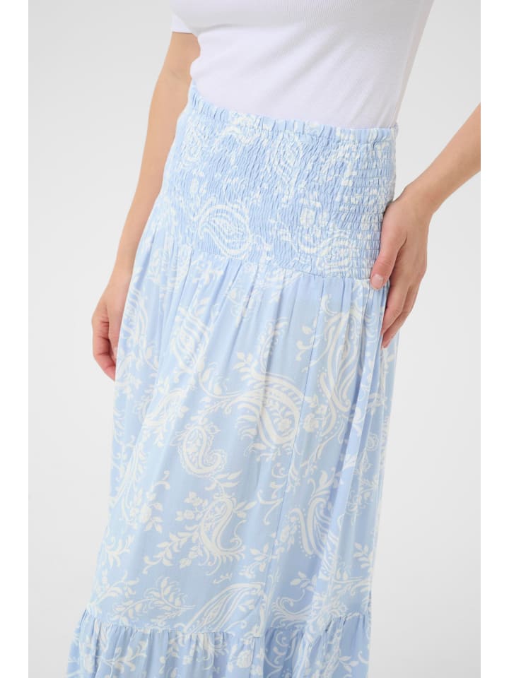 Юбка макси с абстрактным принтом по всей поверхности, широким присборенным поясом и мягким, струящимся многоуровневым силуэтом. Сборки создают современный образ.