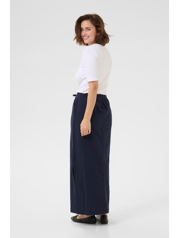 Длинная прямая черная юбка с эластичным поясом на кулиске, большими накладными карманами и разрезами по бокам. Матовая, мягкая отделка.