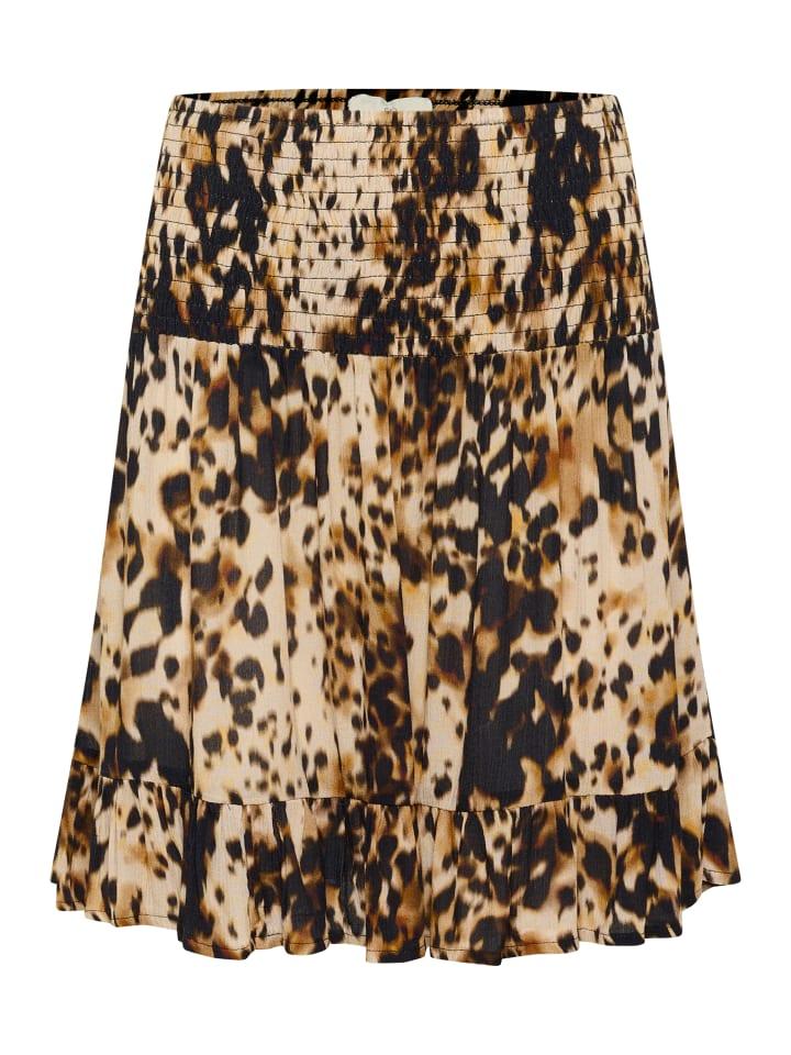 Короткая черная юбка с широким поясом со сборками, свободный крой, легкая прозрачность и отделка воланами для плавных движений.