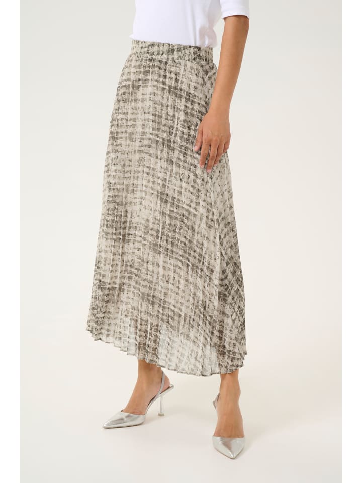 Эта юбка миди имеет структурированную жатую поверхность и абстрактный клетчатый рисунок. Эластичный пояс дополняет расклешенный крой.
