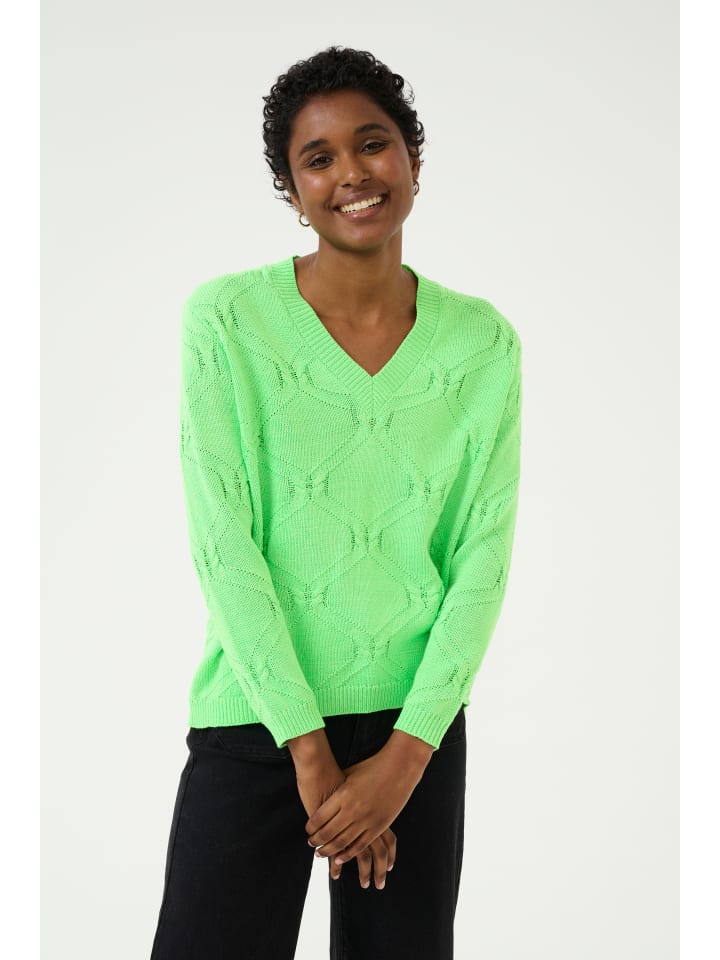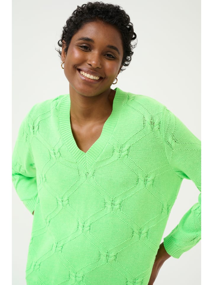 Структурированный свитер с V-образным вырезом, мелким геометрическим узором вязки, свободным кроем, длинными рукавами и ребристыми манжетами.